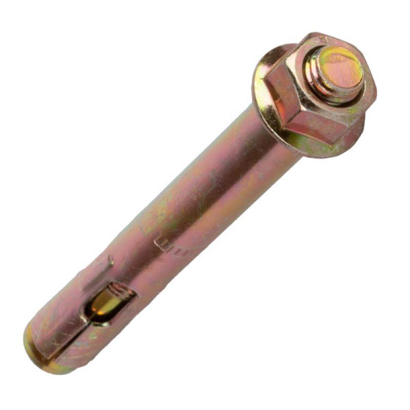 Анкерный болт - Стержень с резьбой и конусообразным хвостовиком, цилиндрической муфтой с продольными прорезями, шайбой и гайкой. Используется для крепления тяжеловесных конструкций, несущих консолей, кабельных трасс, перильных ограждений к бетону, природному строительному камню, полнотелому кирпичу. Может применяться для крепления к тонким бетонным перегородкам. Является универсальным. Сквозная установка в предварительно просверленное отверстие в прикрепляемом материале и бетоне. Затягивается гайкой.