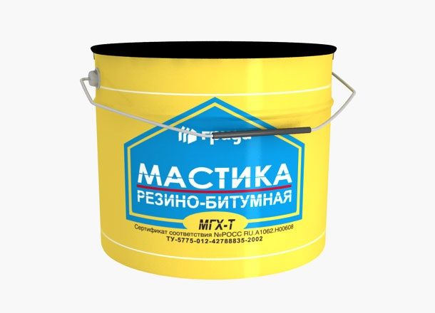 Мастика резино-битумная "МГХ-Т" представляет собой многокомпонентную массу, приготовленную из окисленного битума и тонкого помола резиновой крошки с добавлением различных минеральных наполнителей, синтетического бутодиенстирольного каучука, а также растворителя. Предназначена для приклеивания рулонных материалов, ремонта кровельных покрытий, внешней гидроизоляции строительных и промышленных конструкций эксплуатирующихся при температуре не более 100°С.